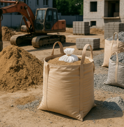 建設や土木の現場では、砂・砕石・セメントなどの資材を小分けで扱うニーズがあります。ここでも丸型・小型(〜500L未満)・内袋付きフレコンバッグが活躍します。