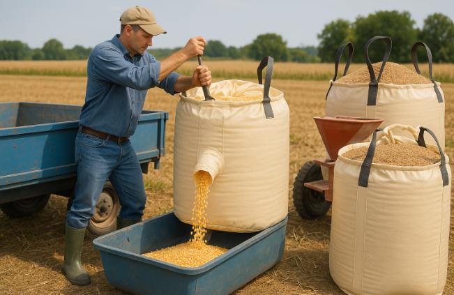 農業分野では、丸型・小型(〜500L未満)・排出口ありフレコンバッグが肥料・飼料・穀物などの運搬や保管に幅広く使われています。