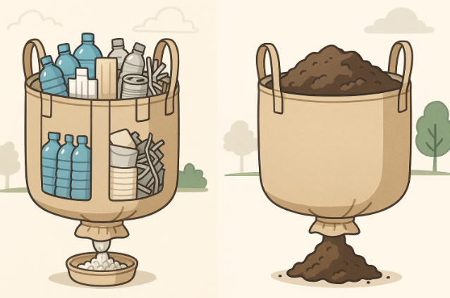 建設・土木現場では、多種多様な資材や廃棄物が発生します。ここで役立つのが丸型・小型(〜500L未満)・排出口ありフレコンバッグです。