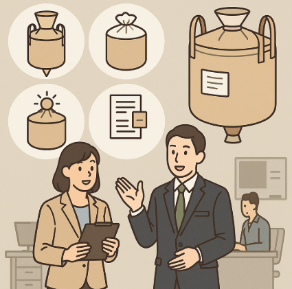 排出口から散布機や肥料袋に直接投入できるため、作業の効率化と省力化に大きく貢献します。肥料販売会社や農業資材卸からも「小型で排出口ありのフレコンバッグを追加で依頼したい」という相談が増えています。