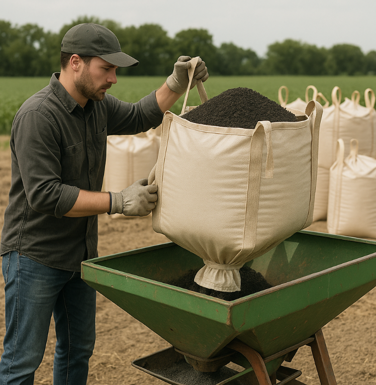 肥料や堆肥を扱う際も、小型フレコンバッグなら効率的。散布機への投入作業も排出口から簡単に行えるため、農業資材会社様からの依頼にも対応可能です。「肥料を省力化して管理したい」という依頼には、このタイプをお勧めしています。