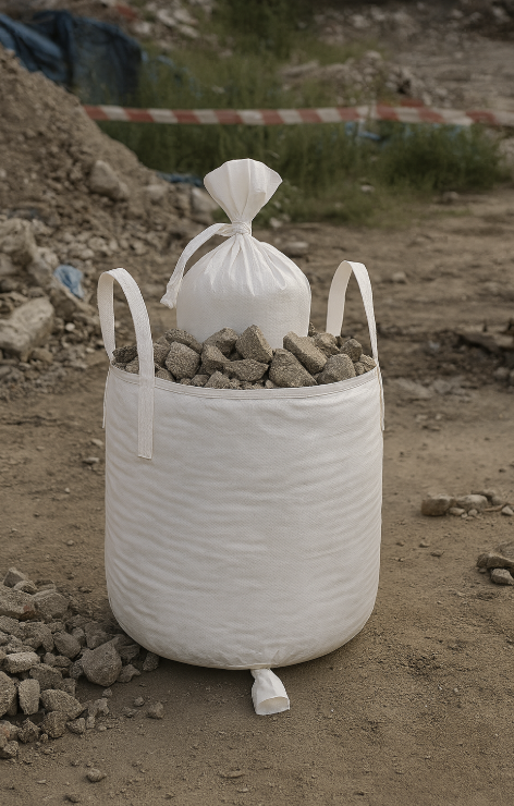 解体作業や道路工事で発生する少量の廃材・瓦礫を収集する場合にも、丸型小型フレコンバッグが活躍します。排出口付きで廃材を選別しやすいため、リサイクル工程への回収も容易です。「廃材を効率的に処理できるフレコンバッグを依頼したい」という声に応えるお勧めの製品です。