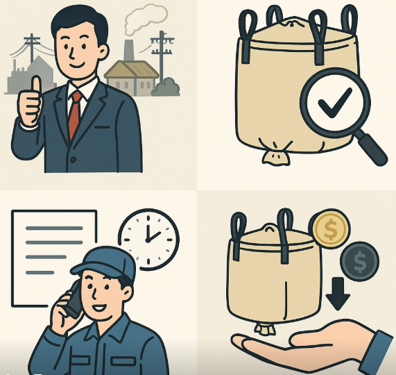 これらの強みから、多くのお客様に「付属品付き・大型(1,500L以上)・排出口ありのフレコンバッグなら株式会社平成」と評価いただいています。
