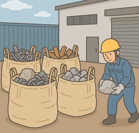 製鉄所や化学工場では、副産物として発生する粉体やスラグを一時保管する際にフレコンバッグを活用。工場敷地内での移動から産廃処理場への搬出まで一貫して利用されています。